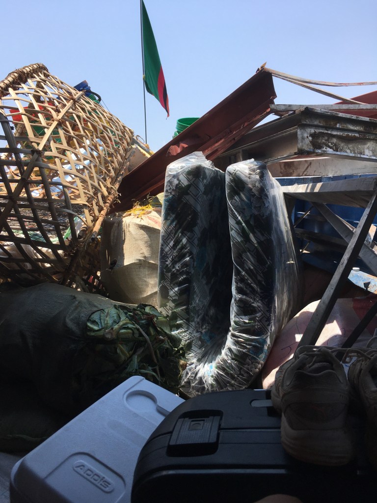 “Be at the Harbour at 8am and get the front seats. Bring alcohol but hide it cause you’re not allowed to have it. Take a big coke bottle and mix it with brandy.” Wise advices that I all followed. Usually, the ferry takes off about 10, latest 11am. But past eleven, people were still busy with loading tons of Nshima bags, crates of different drinks (mostly energy drinks), cabbage, solar panels, chickens (alive of course!), tyres etc. I saw the mark on the boat go down and down until it was underwater (that’s when the boat is overloaded). Stay positive. They don’t do this for the first time. At twelve, the passengers started to get nervous and waited just in front of the entrance area. When the ferry manager finally gave the hand sign of “you can now enter the ferry”, everybody just started running mad! Our hand luggage was already on the front seats but the seats were covered with all sorts of vegetables, plastic bowls, and sacks of unknown content. Finally, the workers made a bit of space for us but in front of us there was a huge untied pile of all kinds of stuff including rusty metal door frames. One wave and this shit will stab me…stay positive. But it was already late and the wind usually picks up in the afternoon. Never underestimate Lake Tanganyika. It is so huge that it behaves like the sea.